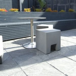 Bold feature planters were used throughout the courtyard to add strong focal points. Large white round planters planted with architectural Yucca plants act as feature points throughout the space, while giant cube planters planted with mature shrubs act as an interesting screening design feature.