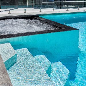 The rectangular shaped pool design being 4 meters above ground was created to work with the property shape and take advantage of the views. The pool and spa have been tiled using Ezarri tiles. The infinity edge pool gives the illusion the water is floating into the distance.