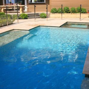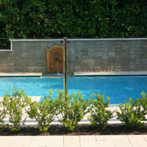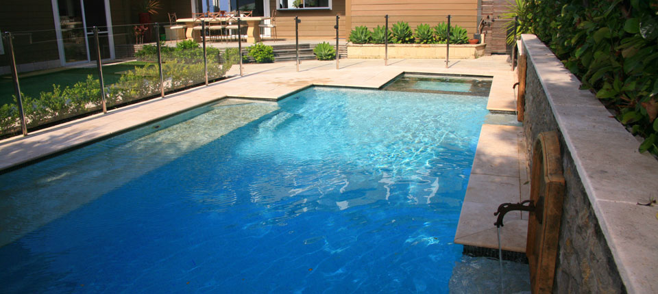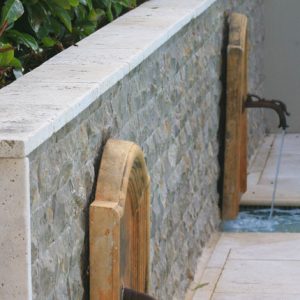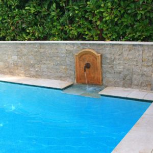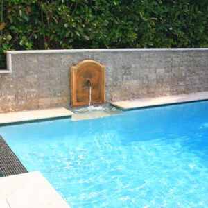Some of the finishes used to create a classic feel are a combination of feature mosaic tiles, large format travertine pavers as the coping material and a stacked stone cladding feature wall. The pool’s charm is the romantic, classically styled water features that adorn the walls. The linear shapes of the spa pool and swimming pool compliment the design of the garden. A clever trick we used here was to continue the paving past the pool area, and into the main garden to link both spaces.