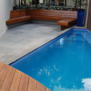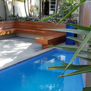 The hardwood timber bench seats were designed to maximise the potential of the entertainment area and give a warm and welcoming feel to the space. By converting the fixed seating into day beds, the owners can enjoy quiet and relaxing time by the plunge pool during the day and then utilise the space for seating & entertaining into the night.