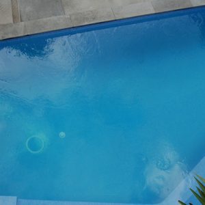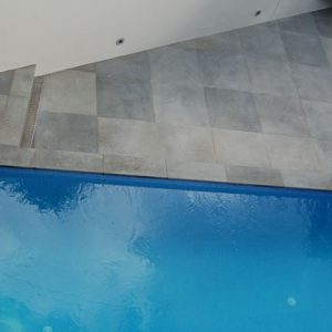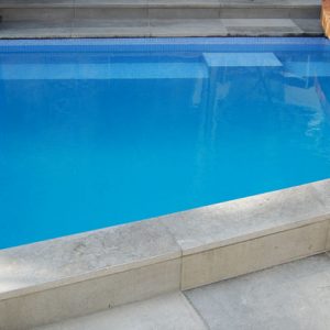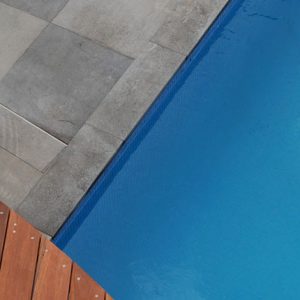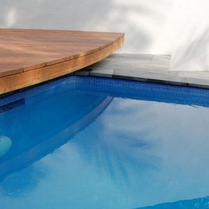 Our aim was to bring warmth and comfort to the space with a contemporary style. The curved hardwood timber deck flows from inside the house and then sits, floating above the pool. Stunning Bluestone pavers were chosen for the coping and paved areas, providing a modern finish that also complemented the timber and blue mosaic tiles of the pool’s interior.