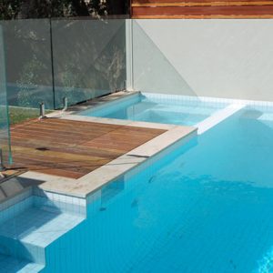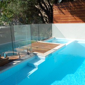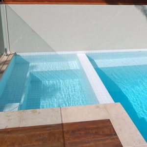 We designed and located the spa to allow for a relaxing place to sit and look back towards the house or at people in the pool. The spa was placed at water level to provide a seamless transition for those wanting to slip from the spa into the pool. White pool tiles were chosen giving the water a very pale sky blue colour making the pool feel larger.