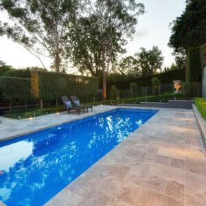 The brief for this traditional new swimming pool design was to complement and integrate with the architectural form of the house. A formal pool design was created by having large open walkways surrounded by traditional landscaping. The fully tiled pool is a simple rectangle surrounded by raised garden beds creating the vision of height in this large backyard. Rebated coping was used around the pool edge with garden art filling a large masonry wall.
