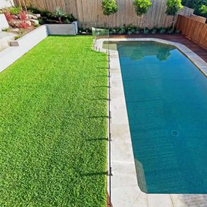 The unused covered area was removed making way for a new large lawn area which will be utilised by young children. New block retaining walls were built around the lawn edges creating new garden beds. Low maintenance plants were selected while the rock out crop was retained adding a natural element to the backyard pool and landscape design.