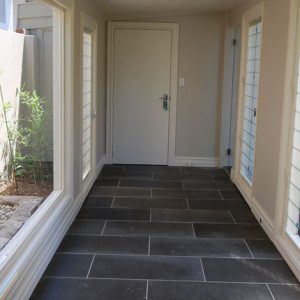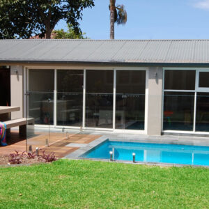 An enclosed, roofed connection was designed to link the house to the pool house so the clients could use the pool-house as an additional entertaining area. The louvered windows on one side of the connection provided a view of the garden. The large single pane glass window on the opposite side allow for a longer view of the miniature bamboo garden and decorative art screen on that side boundary wall.