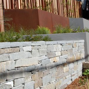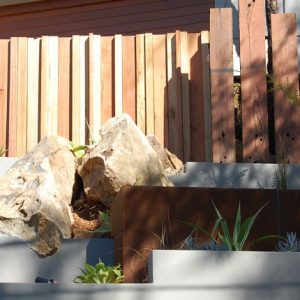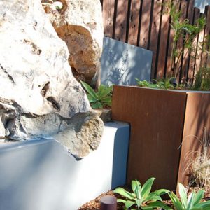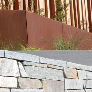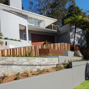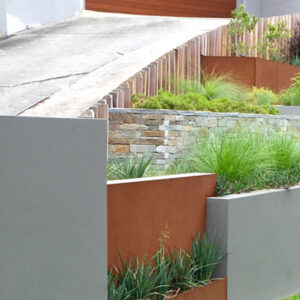 The brief from the client was to design a new front garden and retaining walls with a modern, natural earthy feel. Rather than a large retaining wall dominating the streetscape, several terraced retaining walls were designed with various finishes. Products such as corten steel, stone cladding, Australian hardwood, render and recycled timbers sleepers were used to enhance and open up the property. The plant selection in the garden design was a modern mix of grasses and low shrubs. Native plants and succulents were used in the plant selection for their colour and form and to compliment the materials selected.