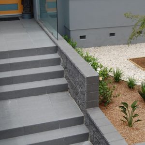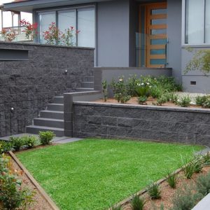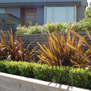 Due to the sloping block, a three tiered garden was designed. A slatted fence and gate created privacy from the street. A low maintenance garden was conceived using water wise plants, a small area of turf and decorative pebbles. The feature of the garden is the weeping Japanese maple located at the front entrance emphasized with decorative pebbles and curved garden bed.