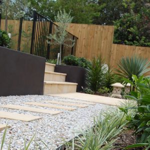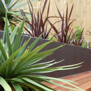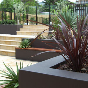 Working with the level changes, we have used strong geometrical lines in the form of rendered block walls to separate the entertaining, garden and pool areas. The walls have been painted a rich deep chocolate which contrast beautifully with the sandstone pavers used throughout the garden.