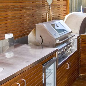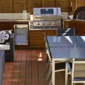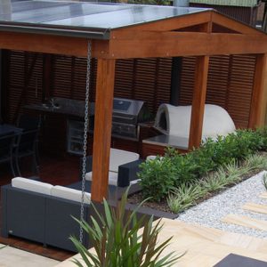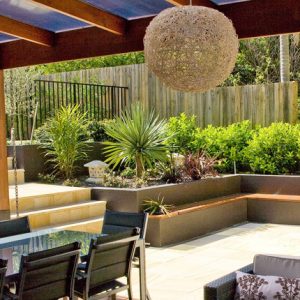 The entertaining area ensures all parties held in this garden are well catered for! There is a bar fridge, bar sink, stainless steel built in bbq and wood fire pizza oven all housed under a beautiful bold weatherproof pergola. Stylish modern furniture was chosen to compliment the overall style of the garden.